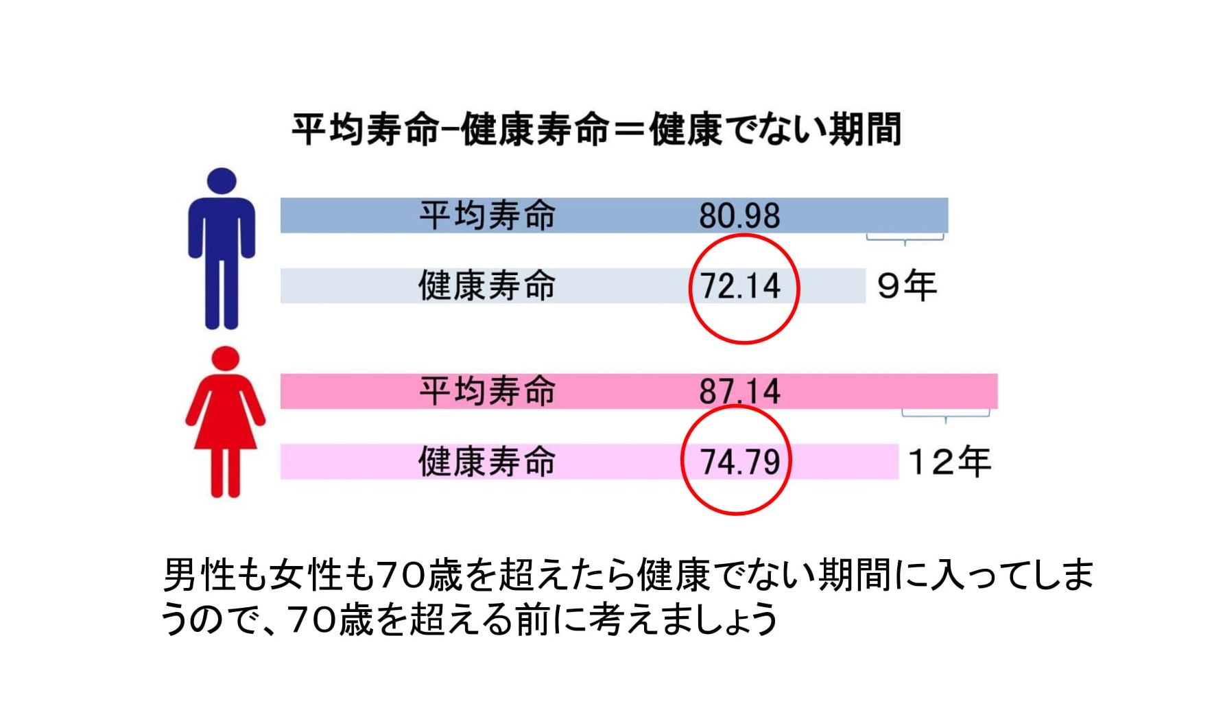 平均的には、男性が9年、女性が12年、健康でない期間があります。