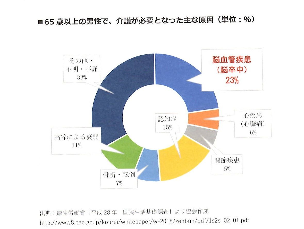 平成28年度時点で、65歳以上の男性の方で、介護(要介護、要支援)が必要となった原因は、認知症15%、脳血管疾患23%=38%ということです。